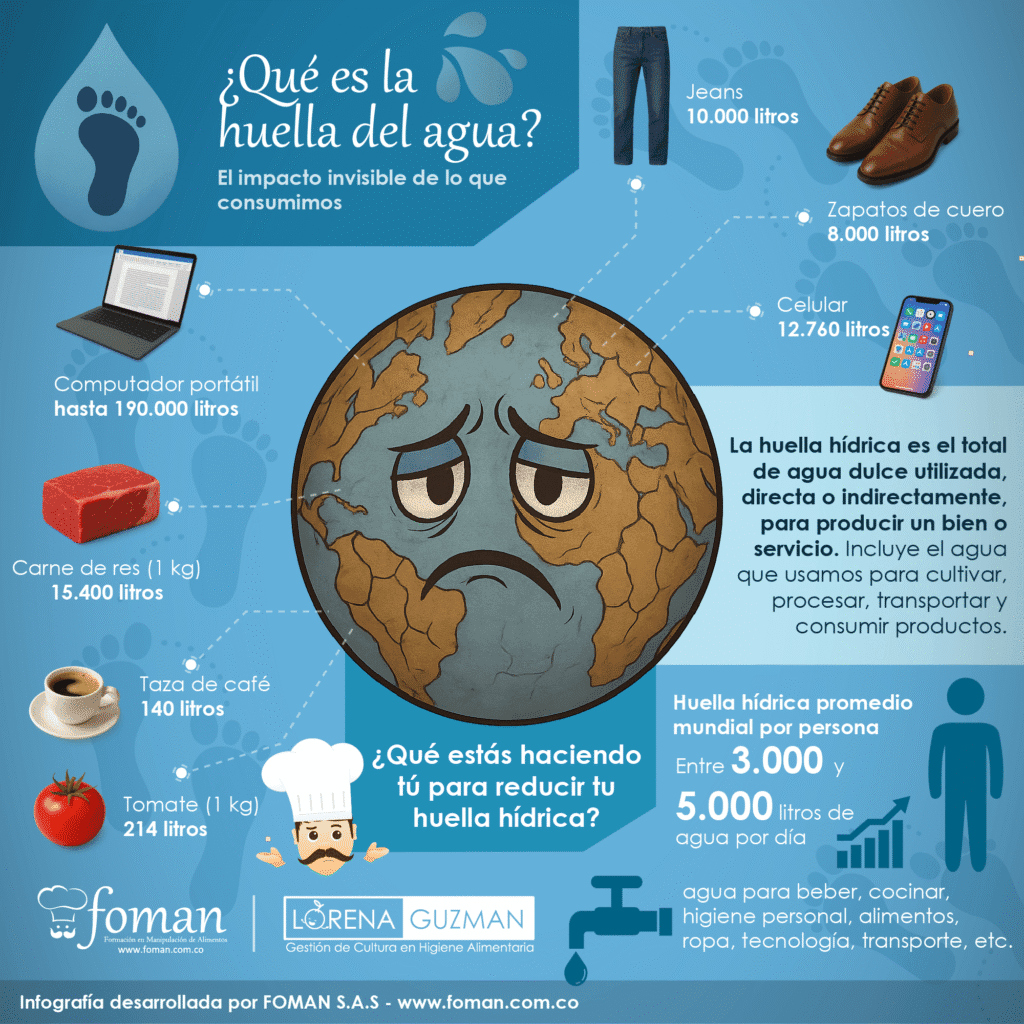 ¿Te das cuenta? Cada alimento que manipulamos, cada prenda que usamos en la cocina, cada equipo que utilizamos, tiene un rastro invisible de agua detrás.