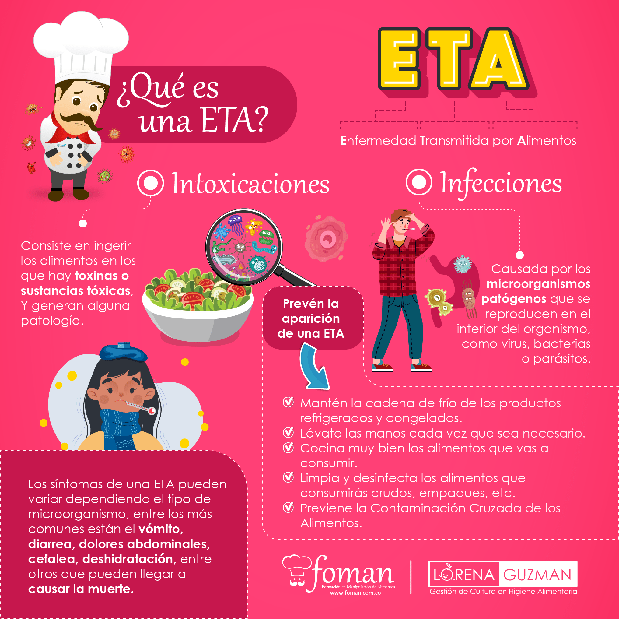 Como manipuladores de alimentos, debemos tener siempre presente toda la información que nos permita realizar nuestra labor sin llegar a causar daño a nuestros consumidores, es por ello que quiero que conozcas un poco más acerca de las ETA, debemos tener claro algunos cuestionamientos, como por ejemplo, ¿Qué son las ETA?, ¿Cuáles son los tipos de ETA?, ¿Cuáles son sus consecuencias?, y ¿cómo podemos prevenirlas?.